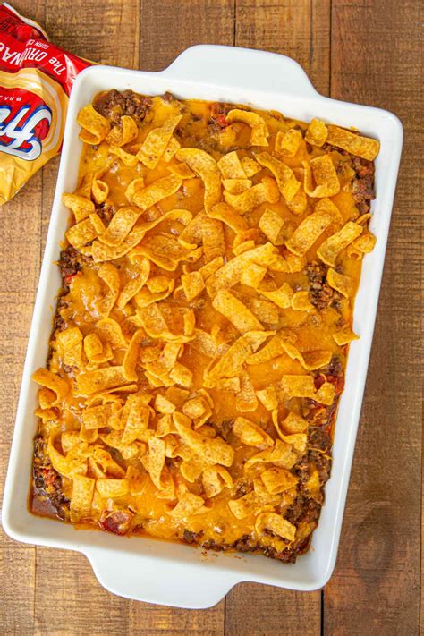 Taco casserole with Fritos is a delicious and flavorful dish that combines the classic flavors of tacos with the crunchy texture of Fritos corn chips. It is a popular comfort food that is perfect for family dinners or gatherings with friends. This casserole typically consists of layers of ground beef cooked with taco seasoning, crushed Fritos chips, cheese, and various toppings such as diced tomatoes, onions, and sour cream. The combination of the seasoned meat, melted cheese, and crunchy chips creates a mouthwatering dish that is sure to satisfy your cravings.To make a taco casserole with Fritos, start by browning ground beef in a skillet over medium heat. Add taco seasoning and water, and simmer until the meat is cooked through and the flavors are well combined. In a separate baking dish, layer the crushed Fritos chips at the bottom. Next, spread a layer of the seasoned ground beef on top of the chips. Sprinkle a generous amount of shredded cheese over the beef layer. Repeat these layers until all the ingredients are used, finishing with a layer of chips and cheese on top. Bake the casserole in the oven until the cheese is melted and bubbly. This taco casserole can be customized to suit your taste preferences. You can add additional toppings such as black olives, jalapenos, or guacamole to enhance the flavor and texture. The Fritos chips provide a unique crunchiness to the dish, making it a satisfying and enjoyable meal. This casserole is also a great option for potlucks or parties as it can easily be prepared in advance and reheated before serving.In summary, taco casserole with Fritos is a comforting and flavorful dish that combines the classic flavors of tacos with the added crunch of Fritos corn chips. It is a versatile dish that can be customized to suit your taste preferences and is perfect for family dinners or gatherings with friends. Give this delicious casserole a try and enjoy the delicious combination of seasoned meat, melted cheese, and crunchy chips.Question and Answer: Taco Casserole With Fritos